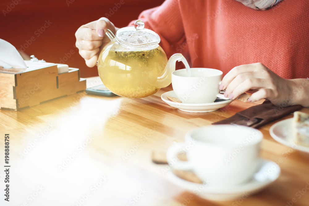 Female hands pour hot tea into a cup. Breakfast in the cafe.aromatic drink,