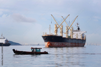 Small passenger boat running in the sea and have cargo ship.