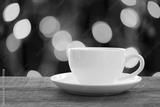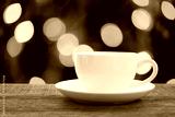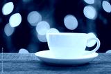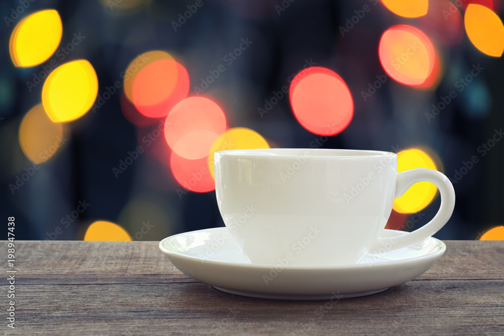 White coffee mug on brown wooden floor and have bokeh light background.