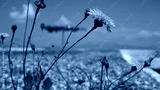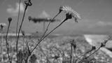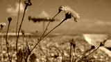 Yellow flowers and the blurred background. Flowers and seaside in the background. Seaside in summer in cloudy day behind the flowers. Cesme, Izmir / Turkey