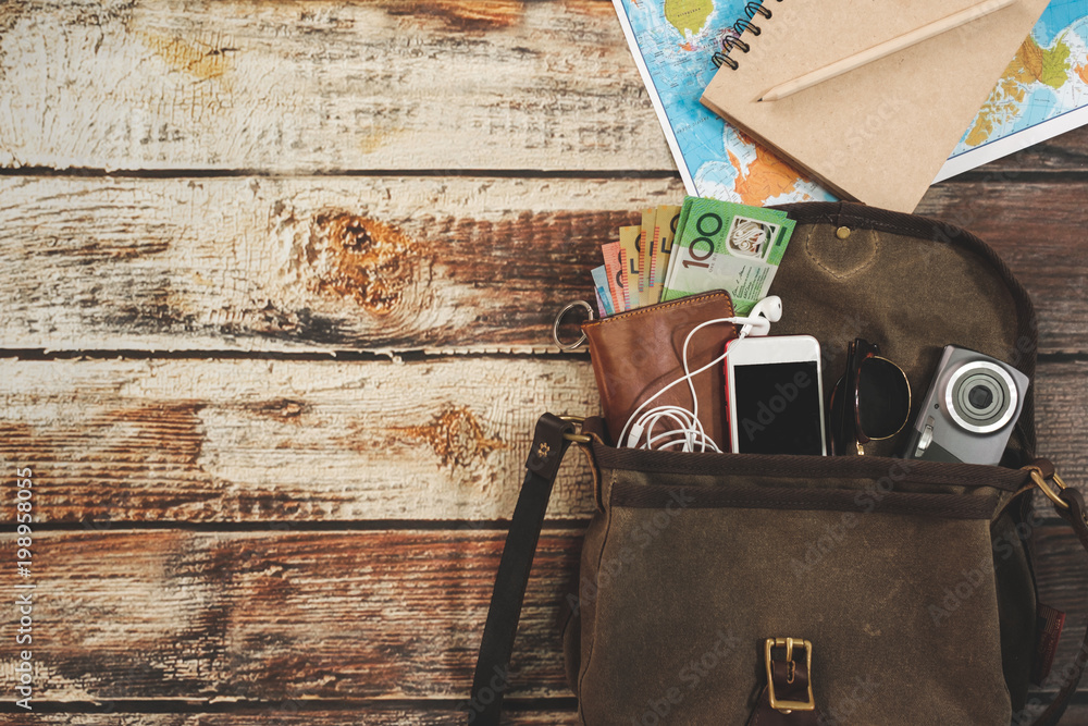 Traveler items vacation travel accessories holiday long weekend day off travelling stuff equipment background view concept