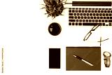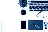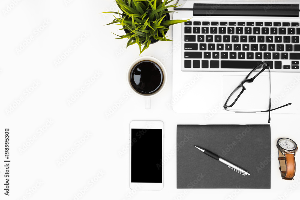 White office desk table with laptop, smartphone and office supplies. Top view with copy space, flat lay.
