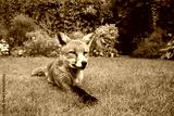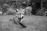 Red fox lying in the garden with flowers