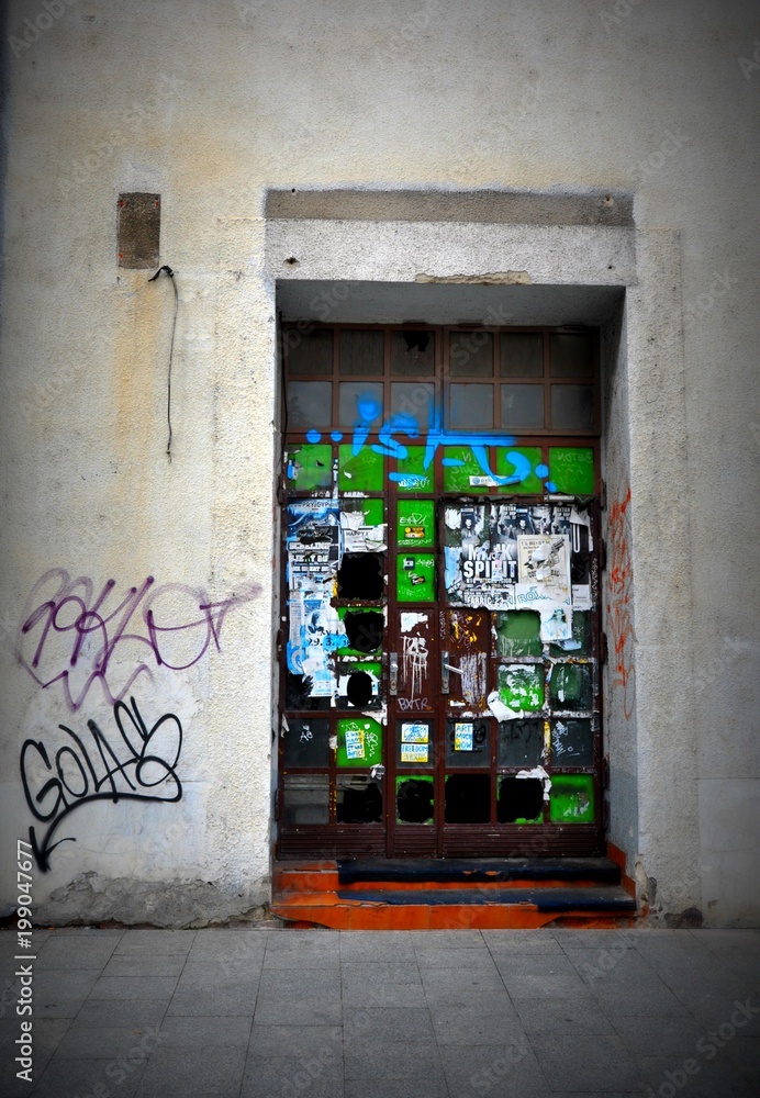Stare drzwi obklejone plakatami, Stodolni, Ostrawa, Czechy