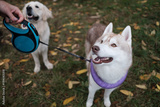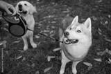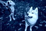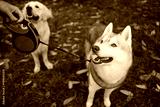 Dogs on walk in autumn park. They are waiting for owner command.