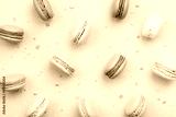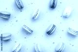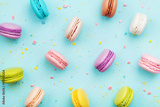Colorful cake macaron or macaroon on turquoise pastel background from above. French almond cookies on dessert top view.