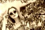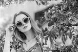 Outdoor close up portrait of young beautiful girl wearing stylish pink sunglasses, necklace, printed dress, posing in street, near spring blooming tree. Female fashion concept. Copy, empty space