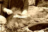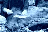Man puts on a large piece of bread a lot of different food with seasonings and spices