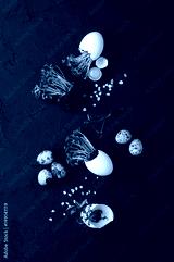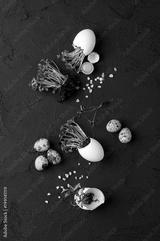 Fresh watercress salad in eggshell and quail eggs on a black background..