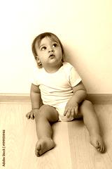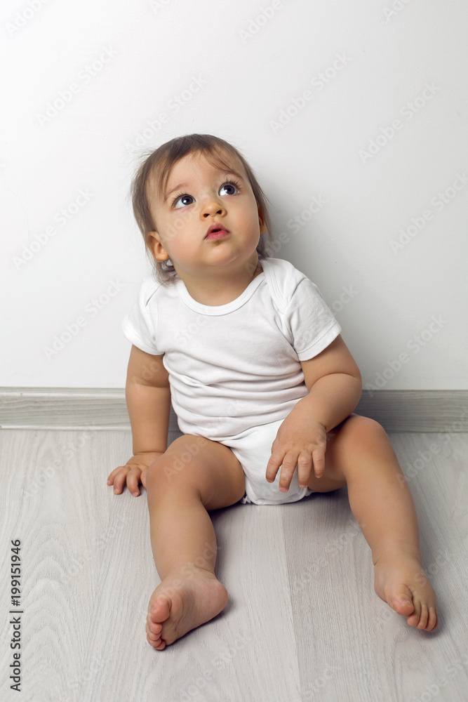 baby boy in white clothes sitting on the floor by the white wall and white laminate floor