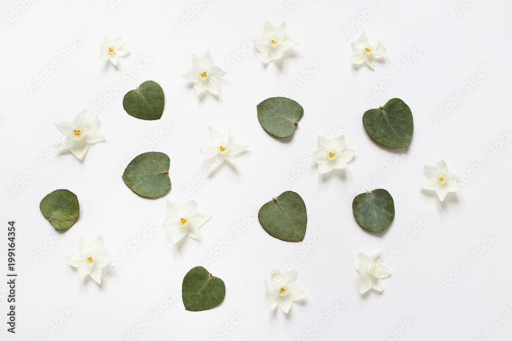 Styled stock photo. Feminine spring desktop composition with white narcissus, daffodil flowers and dry green eucalyptus leaves on white background. Floral pattern. Empty space. Flat lay, top view.