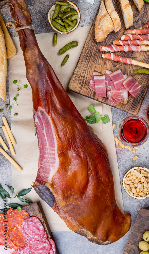 Appetizers table with spanish iberian whole ham jamon serrano, snacks, olives and red and rose wine. Flate lay. Top view. Gray background