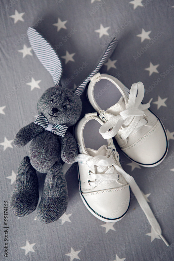 grey knitted toy rabbit, and children's white shoes are on grey background with stars