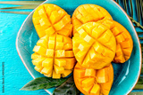 Mango on blue plate. Blue background, palm tree leave, tropical concept
