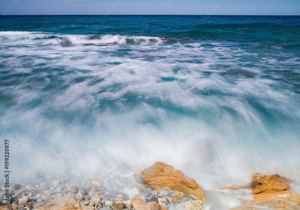 Crete, colorful sea waves at the rocky shore in eastern part of the island. Blurred by motion of the water.