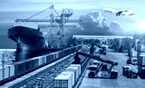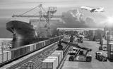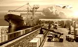 Logistics global technology transportation concept, Container Cargo ship and Cargo plane with working crane bridge in shipyard at sunrise, Container Cargo train and truck for Logistic import export