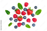 Fresh berries isolated on white background, top view. Strawberry, Raspberry, Blueberry and Mint leaf, flat lay.