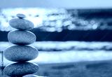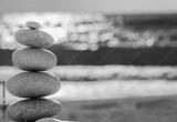 Vintage hipster style Zen meditation background, balanced stones stack on sea beach