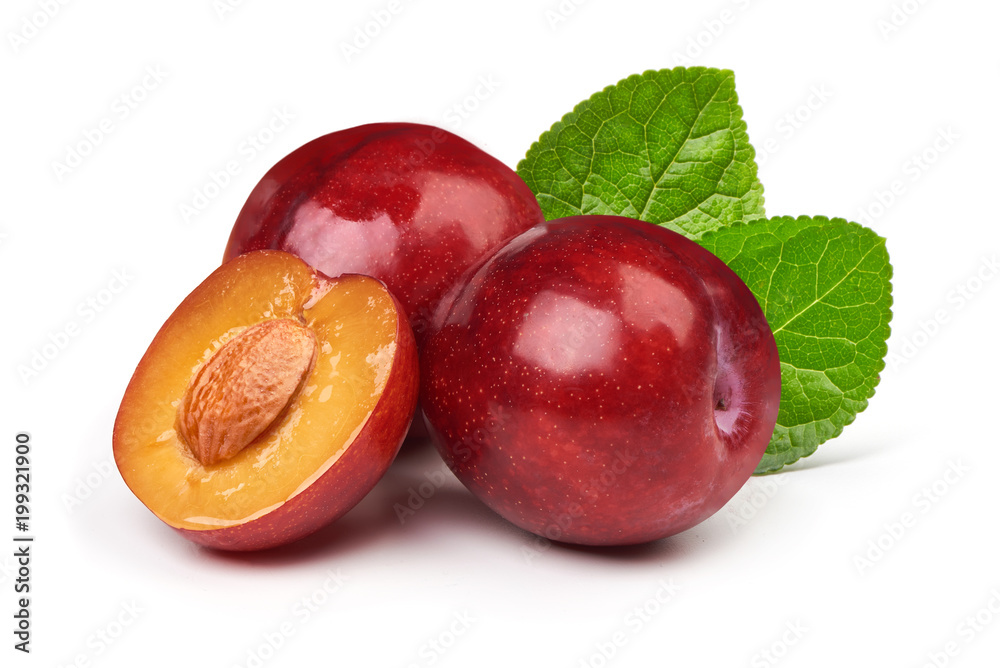 Isolated plums. One and a half of red plum fruit with leaves isolated on white background.