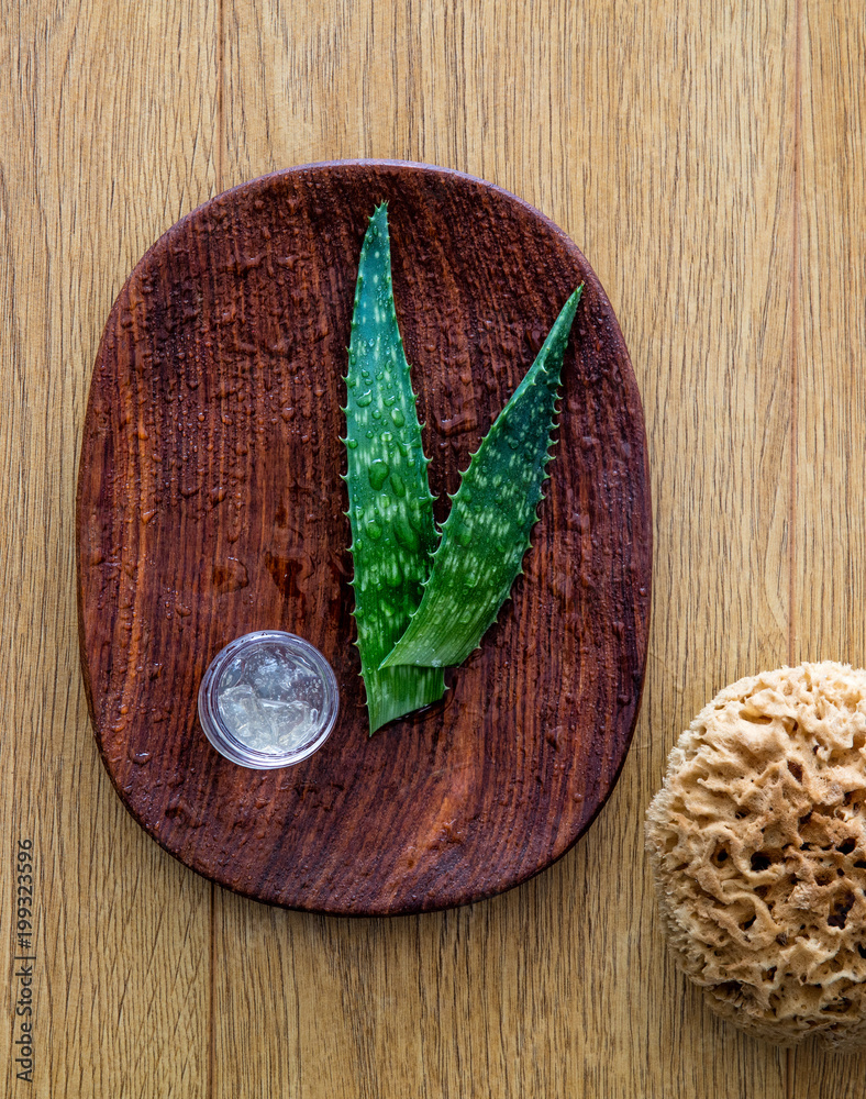 concept of wellbeing with aloe vera gel and natural sponge