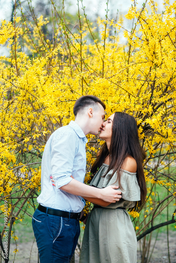 Young happy couple in love outdoors. Man and woman on a walk in a spring blooming park