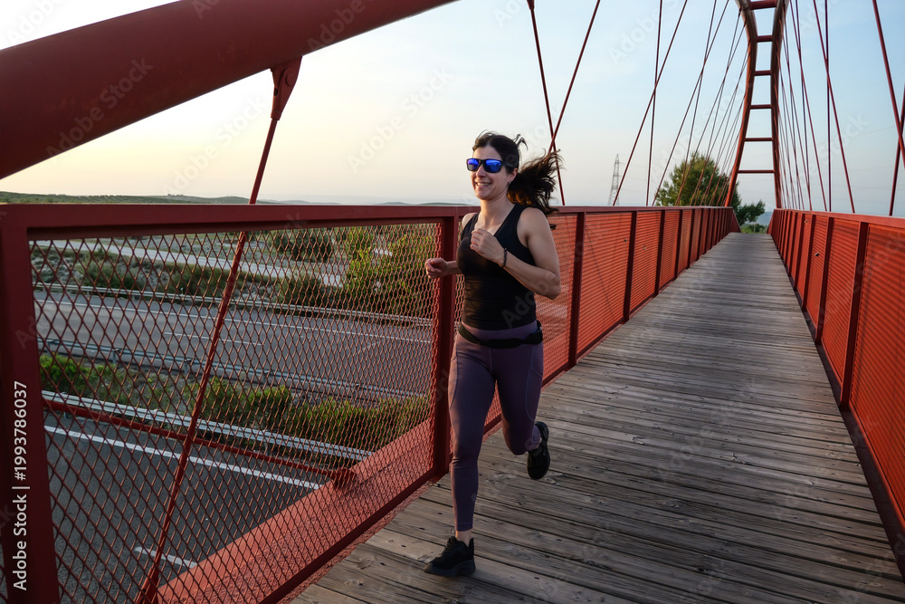 woman with sunglasses running on a bridge
