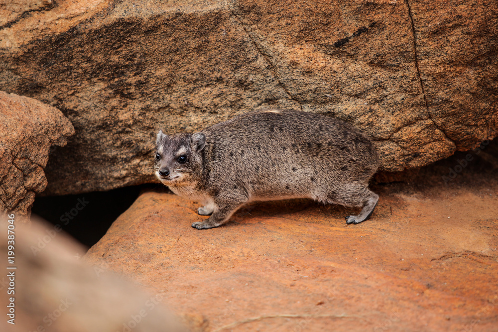 The rock hyrax (Procavia capensis) going to its burrow lair in stones. Tsavo East national park, Kenya