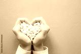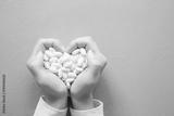 Woman's hands created a heart shape. White pills. Mock up for special offers as advertising or other ideas. Medical and healthcare concept. Copy space. Empty place for text or logo on blue background.
