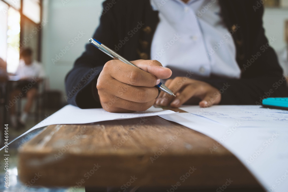 Close up Students writing and reading exam answer sheets exercises in classroom of school with stress.
