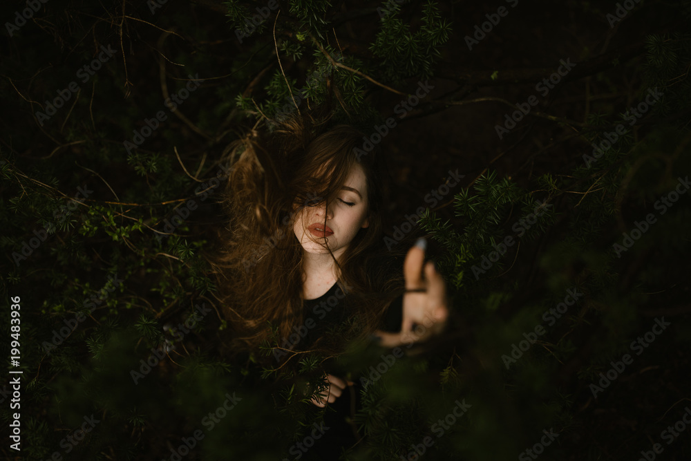 Young Woman Reaching Out with Eyes Closed With Hair Tangled in a Tree