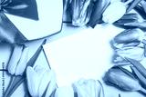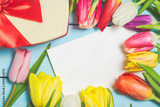 Colorful spring tulip flowers with decorative giftbox and blank photo on light blue wooden background as greeting card. Mothersday or spring concept.