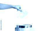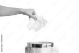Women hand throwing white tissue paper in to a trash bin isolate on white background.