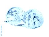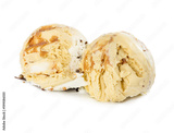 Two vanilla ice cream balls with chocolate and soft caramel isolated on white