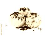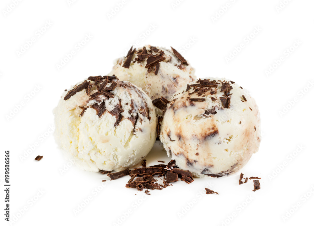 Three balls creamy chocolate ice cream with chocolate chips isolated on white