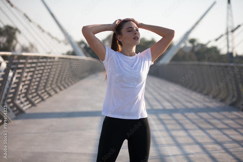 Sports woman in a white T-shirt while training on the bridge. Mock-up.