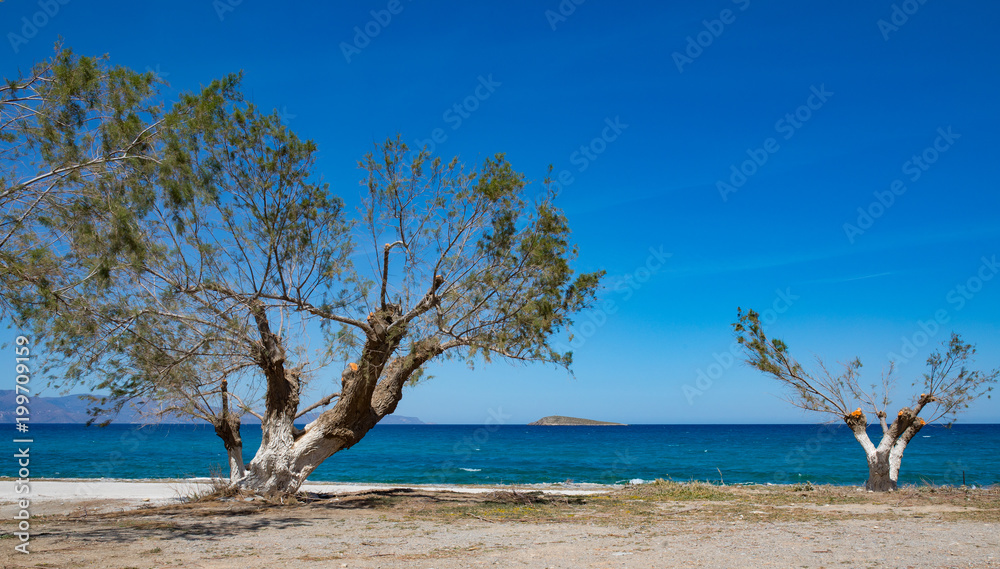 Crete landscape, blue sea and sky on a sunny day in background, rocks and green hills.