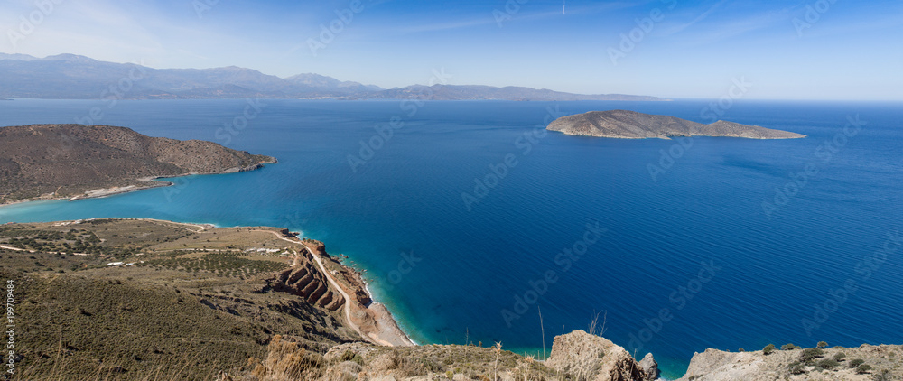 Crete landscape, blue sea and sky on a sunny day in background, rocks and green hills.