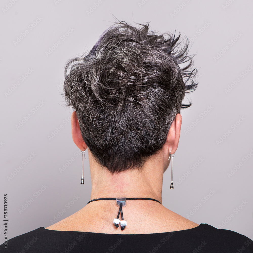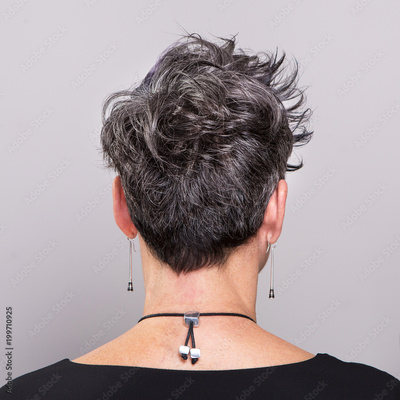 Woman showing hair hairstyle and graying color
