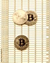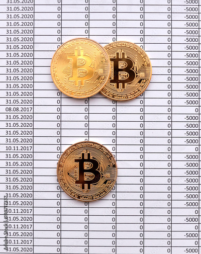 Gold Coins Bitcoin on white background with numbers. price of bitcoin concept, numbers of zero