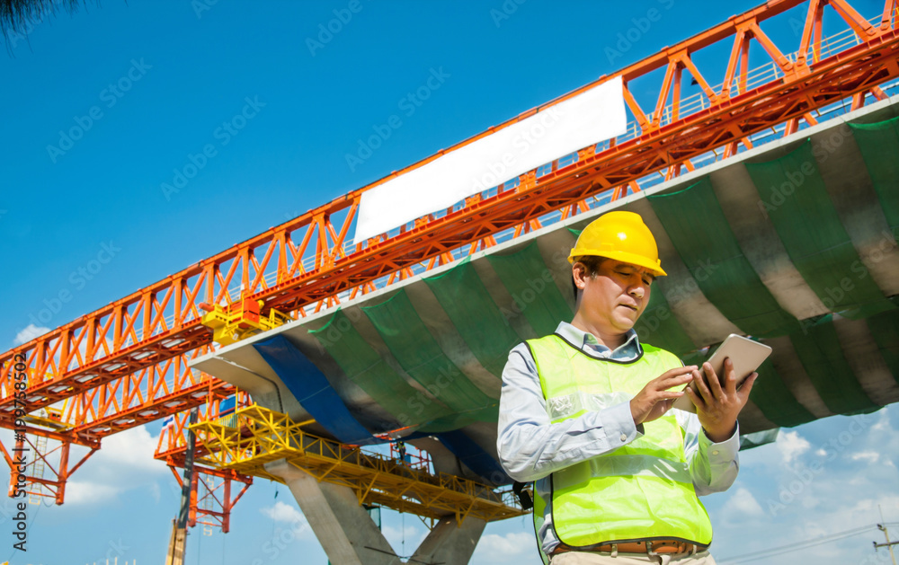 Male Engineer using tablet computer at constructions site for express way project,