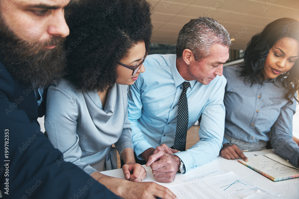 Multiracial office team working with papers together