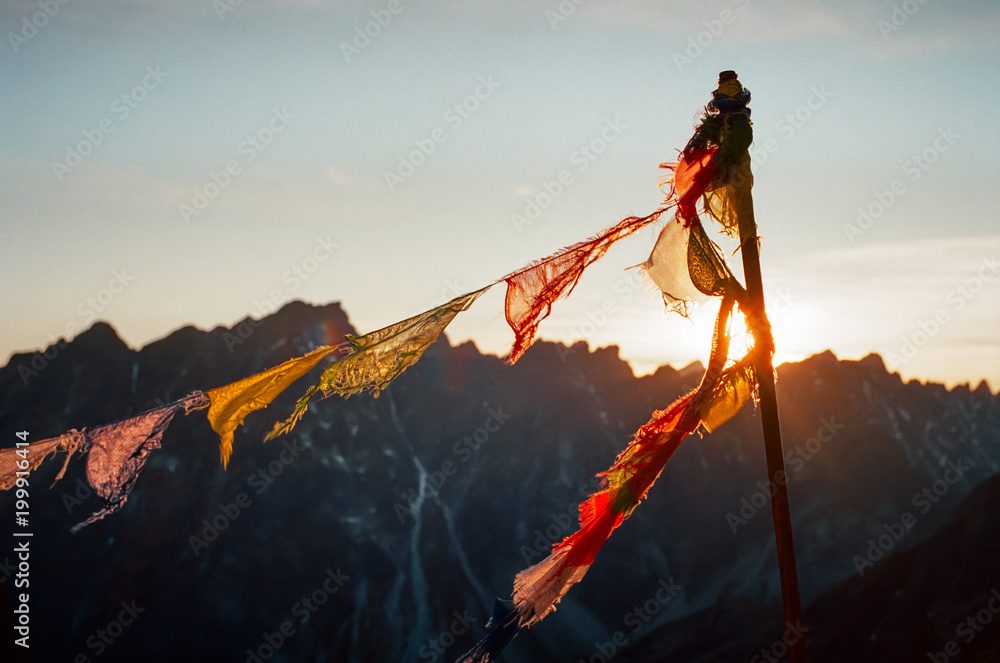 Closeup of peaceful praying flags fluttering on the wind in Rysy mountain at sunset in Slovakia. Shot with film camera and grain.