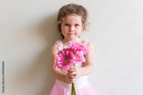 Little girl in pink dance costume holding pink gerberas against neutral wall background (selective focus)