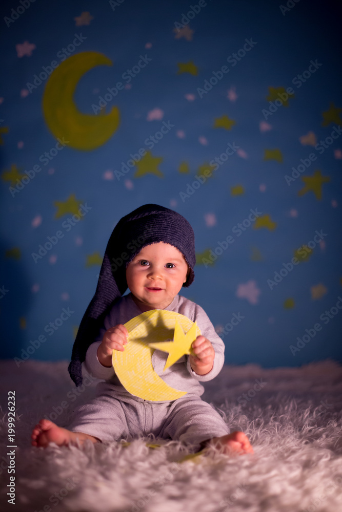 Little baby boy with cute teddy bear and moon on a blue star and moon background
