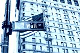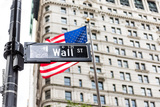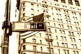 Wall street street sign in New York City NYC Manhattan lower financial district downtown, with American flag, banner, building in background