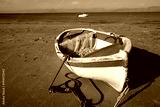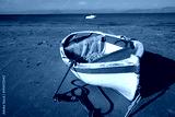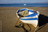 Lonely fisherboat with net and anachor at the coast of Kavos in Corfu, Greece