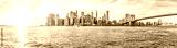 Panoramic Panorama view, overlook of outside outdoors in NYC New York City Brooklyn Bridge Park by east river, cityscape skyline during sunset with sun