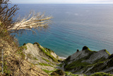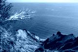 Hidden beach near to Kavos in Corfu viewed from an edge of an abyss with a fallen tree in the front