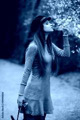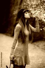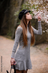 A beautiful girl in a cap is walking around the college. A student is enjoying a spring day.