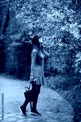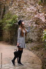 A beautiful girl in a cap is walking around the college. A student is enjoying a spring day.